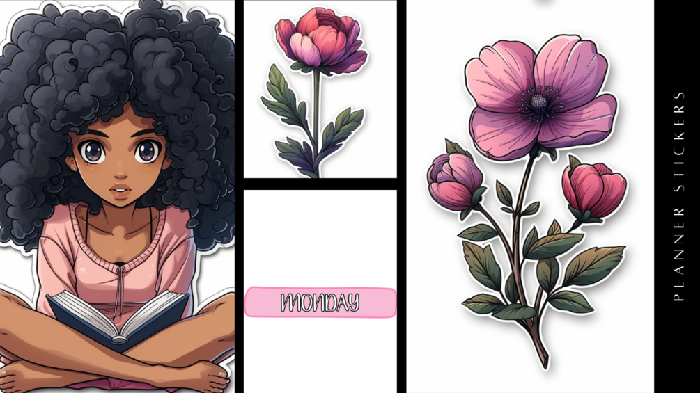 Immerse yourself in a world where each sticker is a botanical masterpiece, seamlessly blending with days of the week labels and the whimsical charm of a girl jotting down her thoughts. Whether you're customizing your digital planner or adding a personal touch to a physical one, Blooms & Plans is your key to a beautifully organized and visually captivating planning journey.